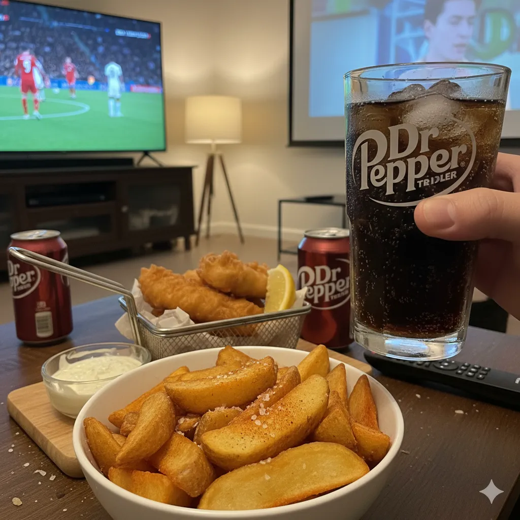 飲料オタクが特に推したいのはこのシーンでの楽しみ方。ドクターペッパーの魅力はなんといっても“体に悪そう感が漂う飲料”だと思ってる。だから23時以降の海外サッカーや金・土曜に夜更かししながら、油ギトギトのウェッジカットのポテトなんかと一緒に体に流し込むドクターペッパーは至高なんです。(これもAIイメージ画像を置いておくね)